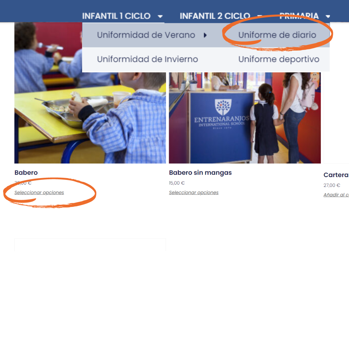 Selecciona el curso y el tipo de uniforme (invierno o verano) en el menú de arriba y añade al carrito los productos deseados.